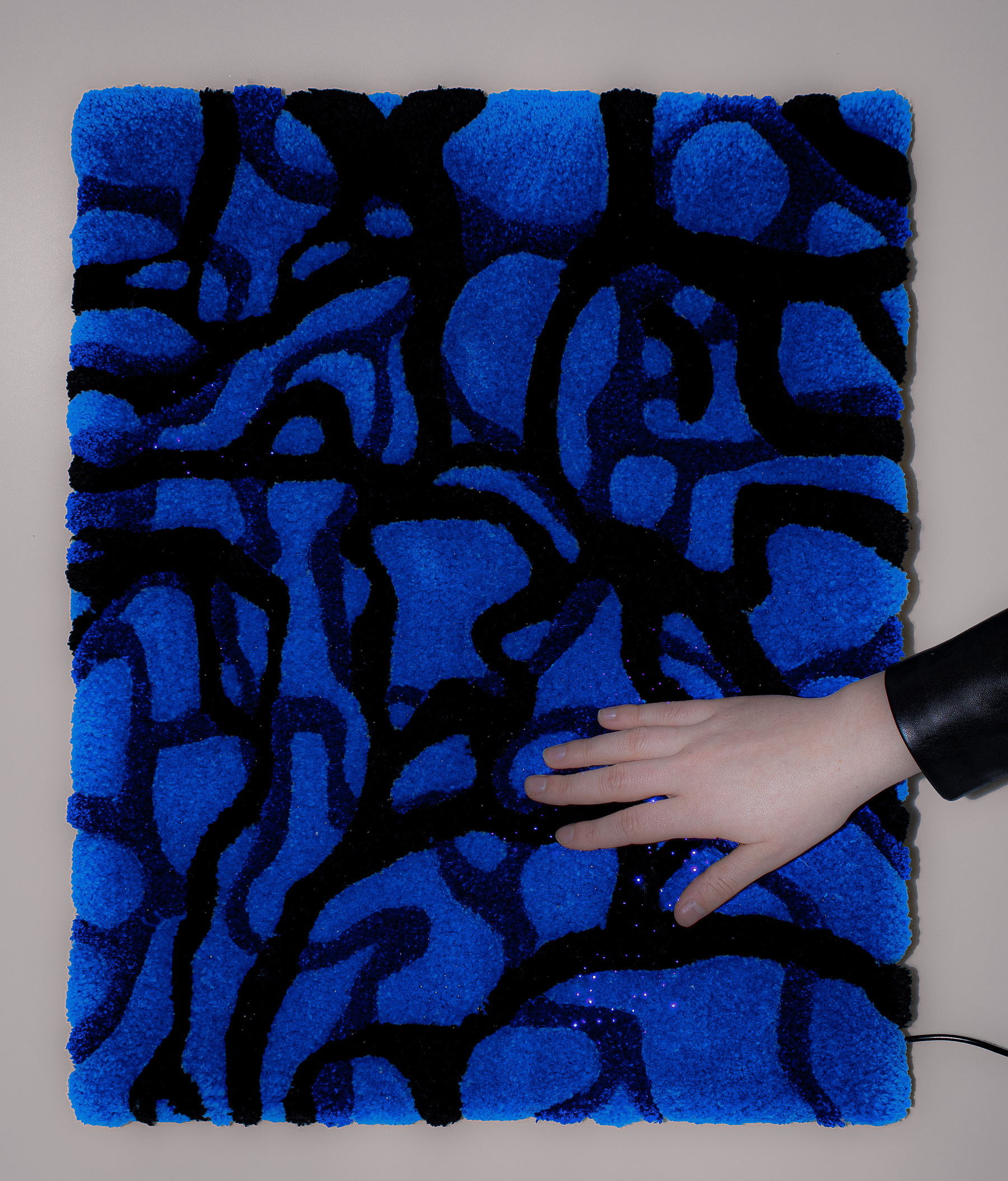 My project started with experimenting with connecting LED lights to homemade buttons, trying out different sensors, and playing with materials like fiberglass and conductive foam. By using these materials in my handmade rug, I named the project “Bedraden Draden” (Wired Threads). The rug, made with light blue, dark blue, and black wool and carefully trimmed, represents the deep sea in the mysterious night. The texture adds a unique touch to the experience. When you touch the rug, something special happens, inspired by the gentle glow of sea sparkles. Just like these sparkles light up when disturbed in the water, this rug reacts to your touch. Feel the rug and experience the enchantment as light follows your movements, like the dance of sea sparkles in the nightly sea. I take pride in this work. It’s not just a lit-up rug; it’s a creative expression offering a full sensory experience. It invites admiration, reflection, and a moment of calm in the midst of daily chaos